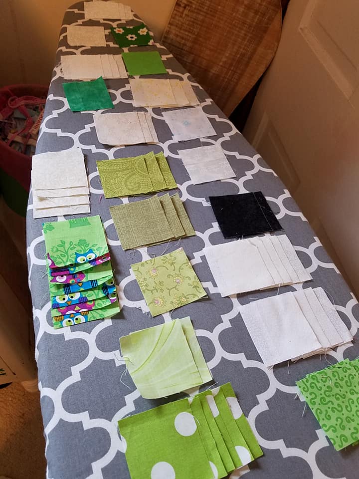 I raided my 2.5" squares and then moved on to my stash, managing to get all I needed for 49 blocks from just my stash of greens, greys, blacks and off-whites. (And, for the most part, you can't tell they're gone - uh oh!)